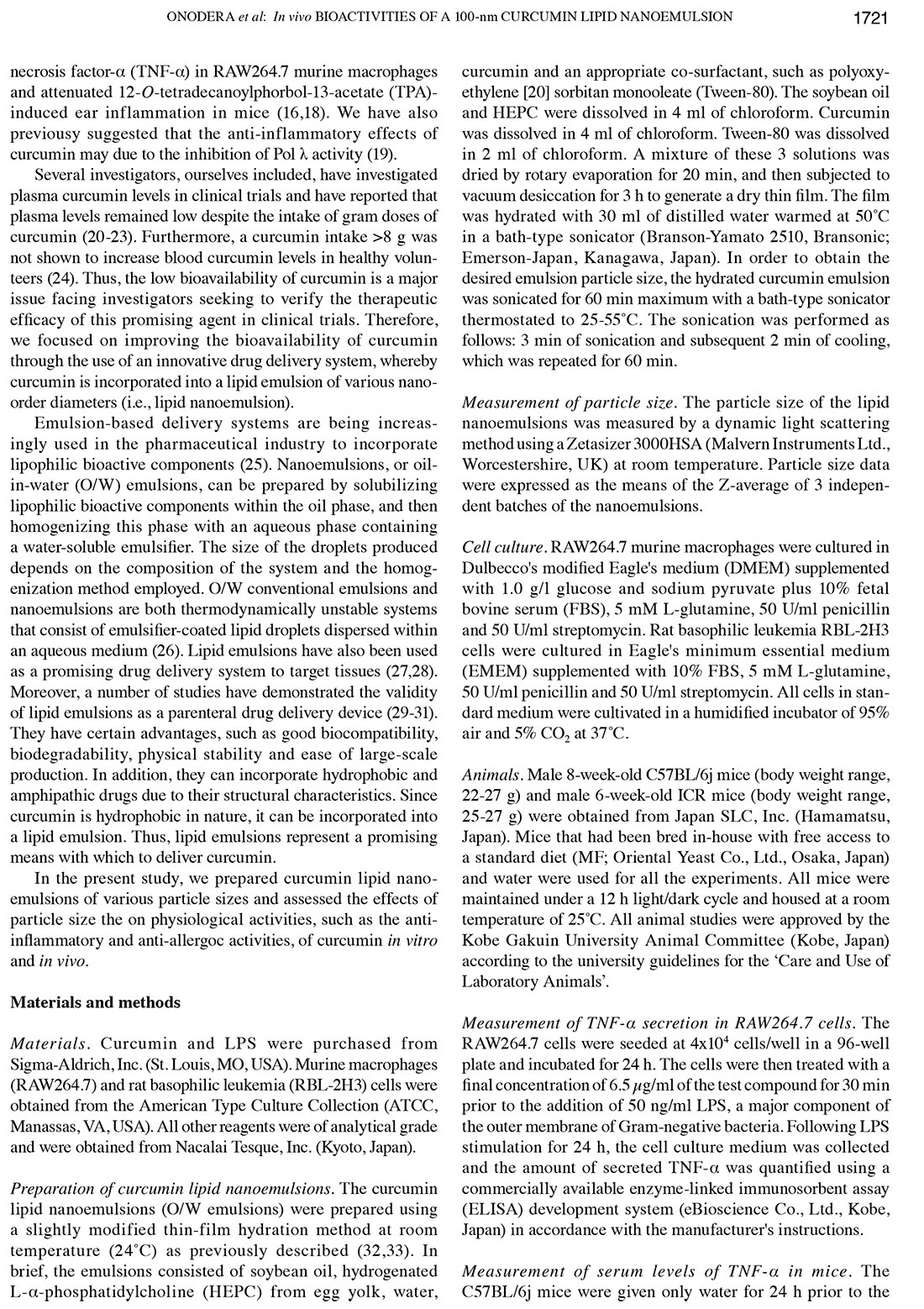 Influence of particle size on the in vitro and in vivo anti-inflammatory and anti-allergic activities of a curcumin lipid nanoemulsion
